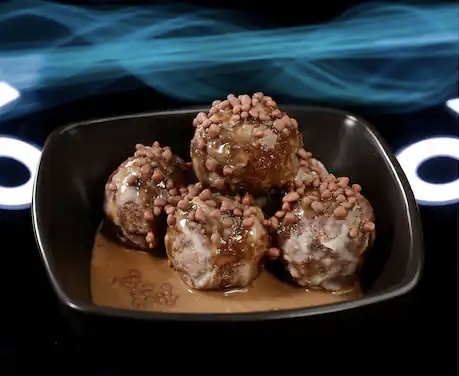Now onto the savory options. If you love buffalo chicken and dumplings, you’re in luck because Energy Bytes is combining both of these classics into one delicious concoction – Digital Dumplings – Buffalo Chicken. This bite perfectly combines chicken dumplings, blue cheese powder, and cayenne pepper broth.